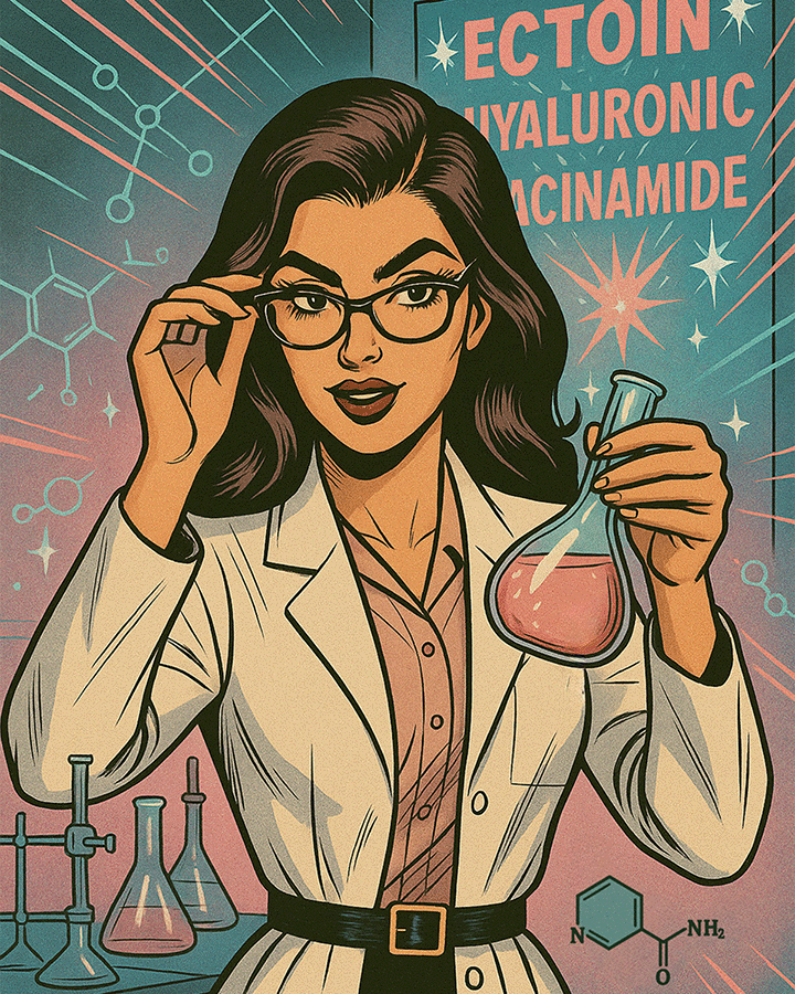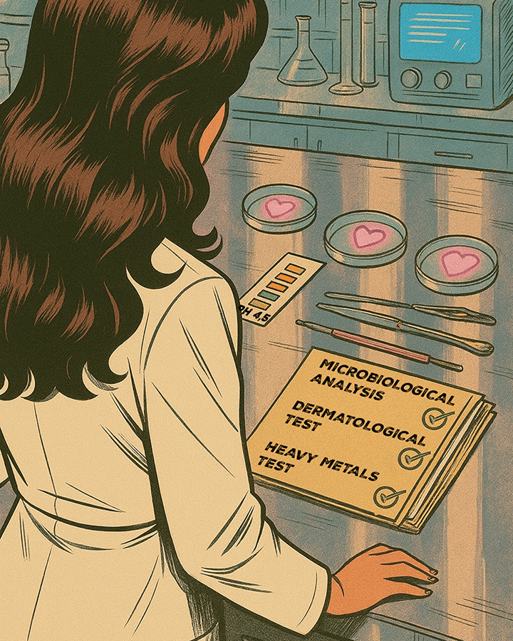 As for the mysterious character on our visuals? That’s her alter ego. Chiara makes the formulas. Her illustrated twin steals the spotlight.